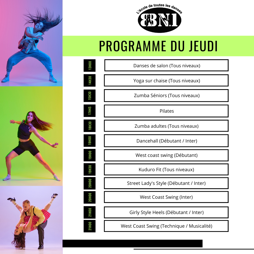 Be Bop, Salsa, Bachata, Cabaret, Danses de salon, Tango argentin, Danse classique, Heels (girly), Danse orientale, Street Lady’s Style, Dancehall, French Cancan, Zumba, Kuduro’fit, Lindy hop, Rock swing, Balboa, Lady styling salsa & bachata, West Coast Swing, Yoga… Tous les styles sont proposés chez BBN1.